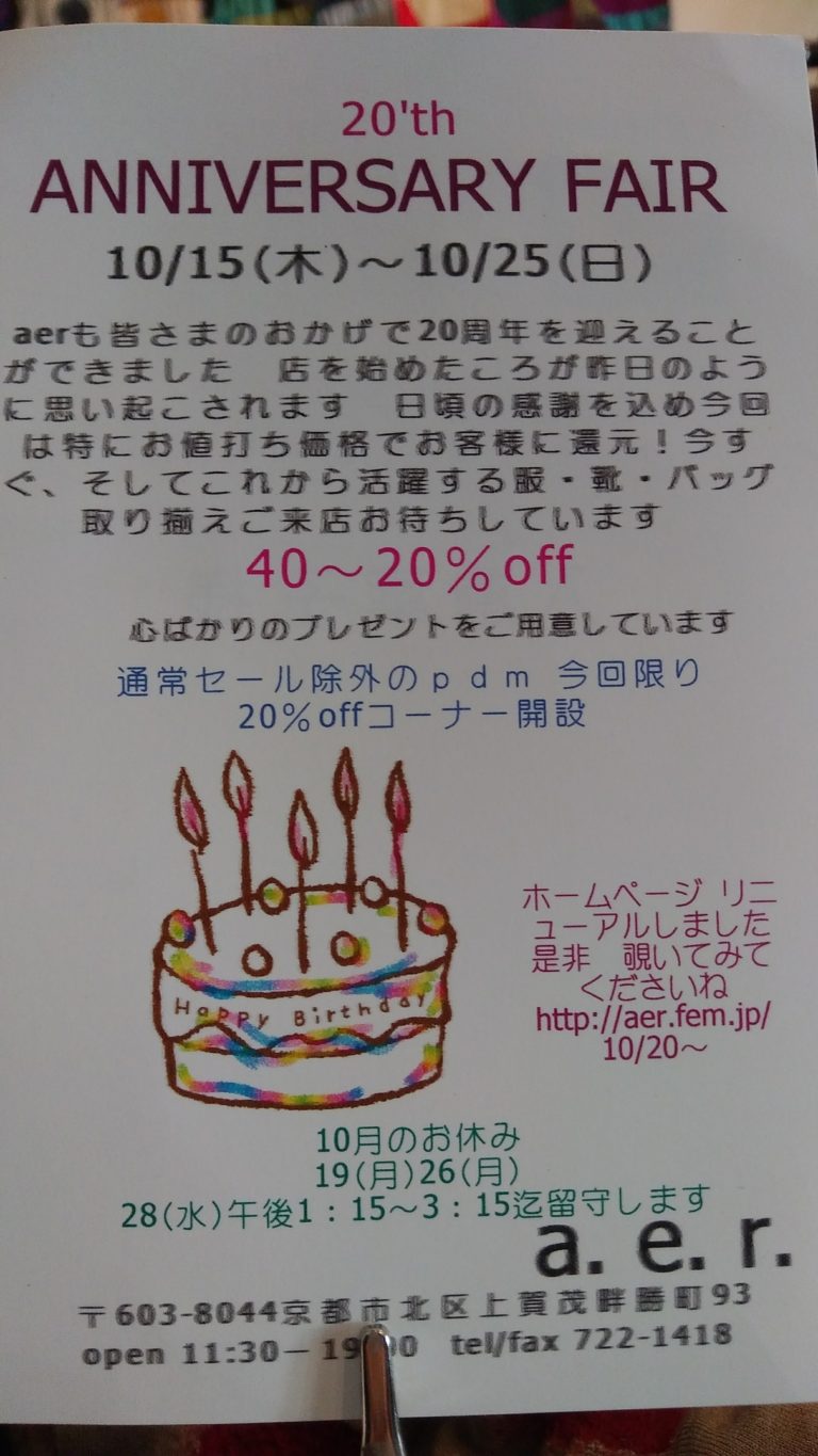 今回のANNIVERSARY FAIRに沢山お越しいただき お祝い メッセージも 頂戴し 感謝!感激!です これからも洋服をとおして aerが くつろげるほっとした空間でありたいと思います これからもどうぞよろしくお願いいたします もっと早くお礼をと […]